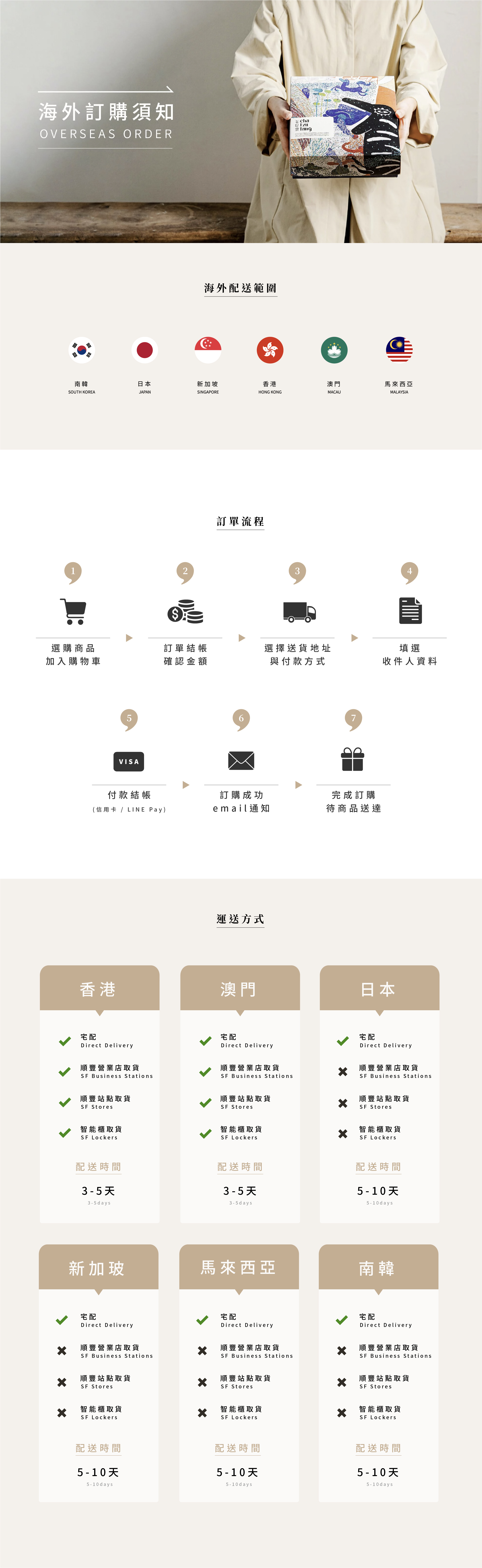 ※ 海外運送跨國處理流程作業時間較長,為了讓您能儘快收到商品,請留意填寫收件地址的正確性。